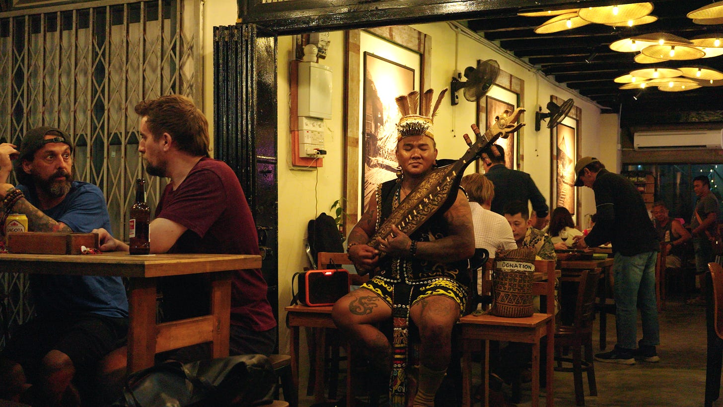 The night before I left for my own longhouse stay, I also met Desmond, a young Iban musician performing traditional songs at Jak Ma’An while drinking my mandatory carrot juice. He sat at the front entrance of the bar with his sape’—a long, carved lute whose tones hang heavy in the air, like smoke. His playing was precise, but never rigid. A small rattan basket sat beside him for donations.