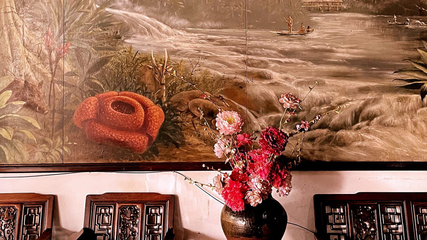 The Kuching Waterfront Lodge is one of those hotels that survives by charm alone. Not expensive, but full of personality. Its narrow hallways smell faintly of mildew, the rooms are perpetually damp, and the décor walks a strange line between antique Chinese guesthouse and colonial oddity museum—bronze spears hung on blood-red walls, faded wall art imbued with symbolism, and animal skulls that loom over staircases like reminders. There’s a smoking atrium built into the heart of the building, enclosed but open to the light. That’s where I met C and K, two best friends travelling from Paris.